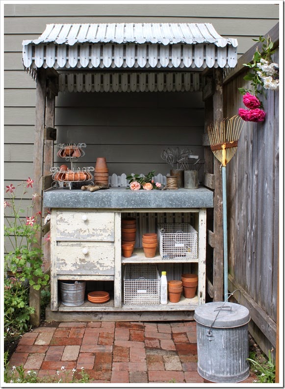 Add a little roof and a brick floor and you pretty much have a potting bench garden room. Isn't this a sweet set up from Fishtail Cottage.