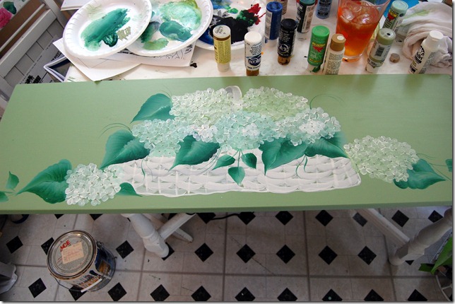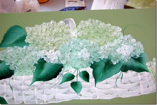 I received an order for a sign with a basket of hydrangeas painted all in greens and whites. The wording will be added later today but here it is so far.