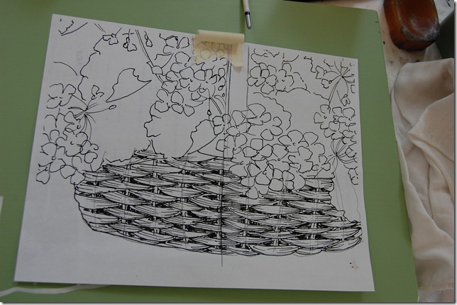 The basket here was not wide enough but it was merely an inspiration piece and easily expanded. I did a light sketch on the wood and outlined it with a liner brush.