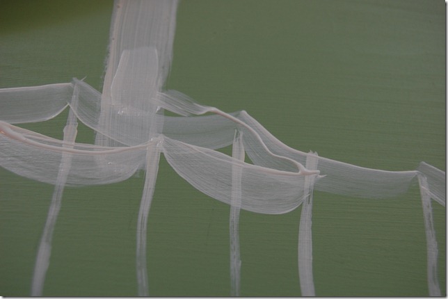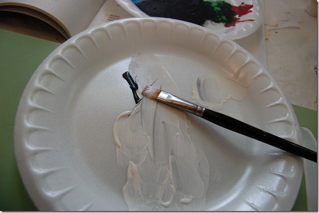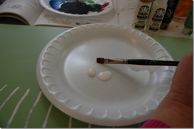 I use these foam plates from Costco, I have fancier palettes but I always go back to using these so I constantly have a stack of them in my studio. A package lasts me a year or longer. You can see the 2 pools of white, Wicker White and Ivory white that I will use for the basket weave. I will double load the brush with the 2 colors. I love Loew-Cornell’s Golden Taklon brushes, this is a 7300- #10 Shader brush. I have to order them online as I have not found any at places like Michaels or JoAnn’s. I need the higher quality brushes to get the effects in my decorative painting that I just can’t get with the cheaper quality brushes.
